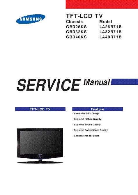 Presently you are looking with regard to an Samsung La26r71b Service Manual Repair Guide example of which we provide here in some kind of document formats like as PDF, Doc, Strength Point, and in addition images of which will make it simpler for you to create an Samsung La26r71b Service Manual Repair Guide yourself. For a more clear look, you can open a few examples below. All of the examples about Samsung La26r71b Service Manual Repair Guide on this web site, we get from a number of sources so you can create a better document of your own.When the search you obtain here does not complement what you are looking for, please utilize the research feature that we have provided here. You are usually free to download anything that we provide in this article, expense cost you the particular slightest.